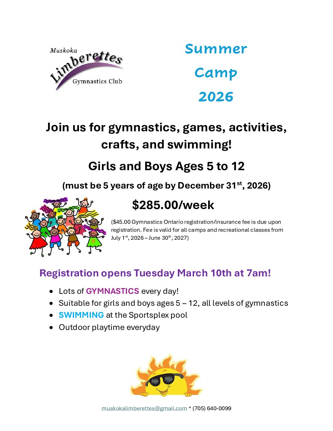 - Camp is $285.00 per week; the $45.00 Gymnastics Ontario insurance/registration fee is due for the 2026/2027 season.